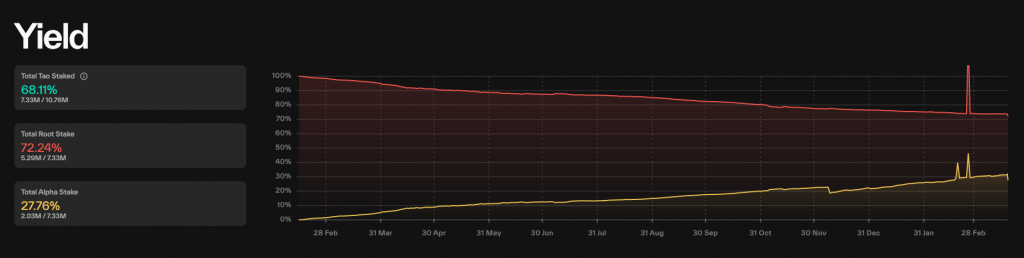 Sur le plan économique, la dynamique du $TAO est devenue proprement fascinante. Le prix a franchi la résistance psychologique des 280 $, porté par une statistique clé : 68 % de l’offre en circulation est actuellement verrouillée (stakée).