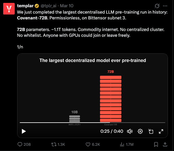 Pourquoi est-ce une révolution ? Historiquement, entraîner un modèle de 72 milliards de paramètres nécessitait une connexion ultra-rapide (InfiniBand) entre les GPUs dans un seul et même centre de données. Bittensor a prouvé le contraire :