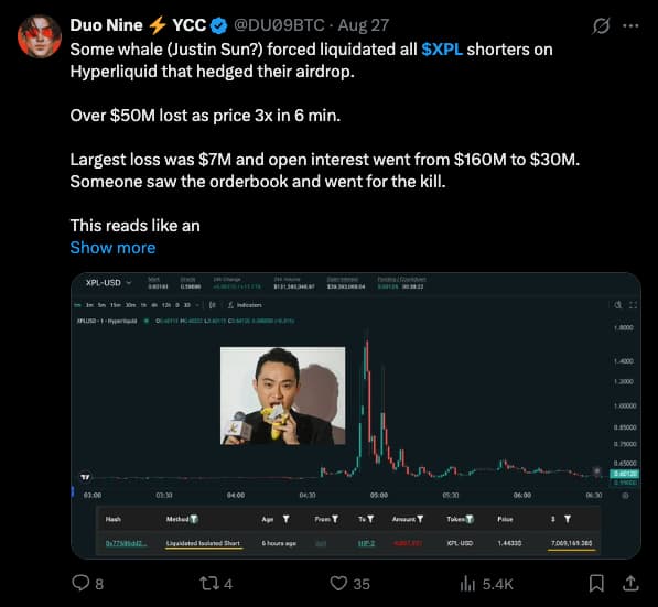 En août 2025, quatre grosses whales ont réussi à manipuler le prix du token $XPL sur la plateforme décentralisée Hyperliquid. Concrètement, ils ont utilisé la faiblesse du système pour faire artificiellement monter le prix du token de 200% en quelques minutes, jusqu’à 1,80$.