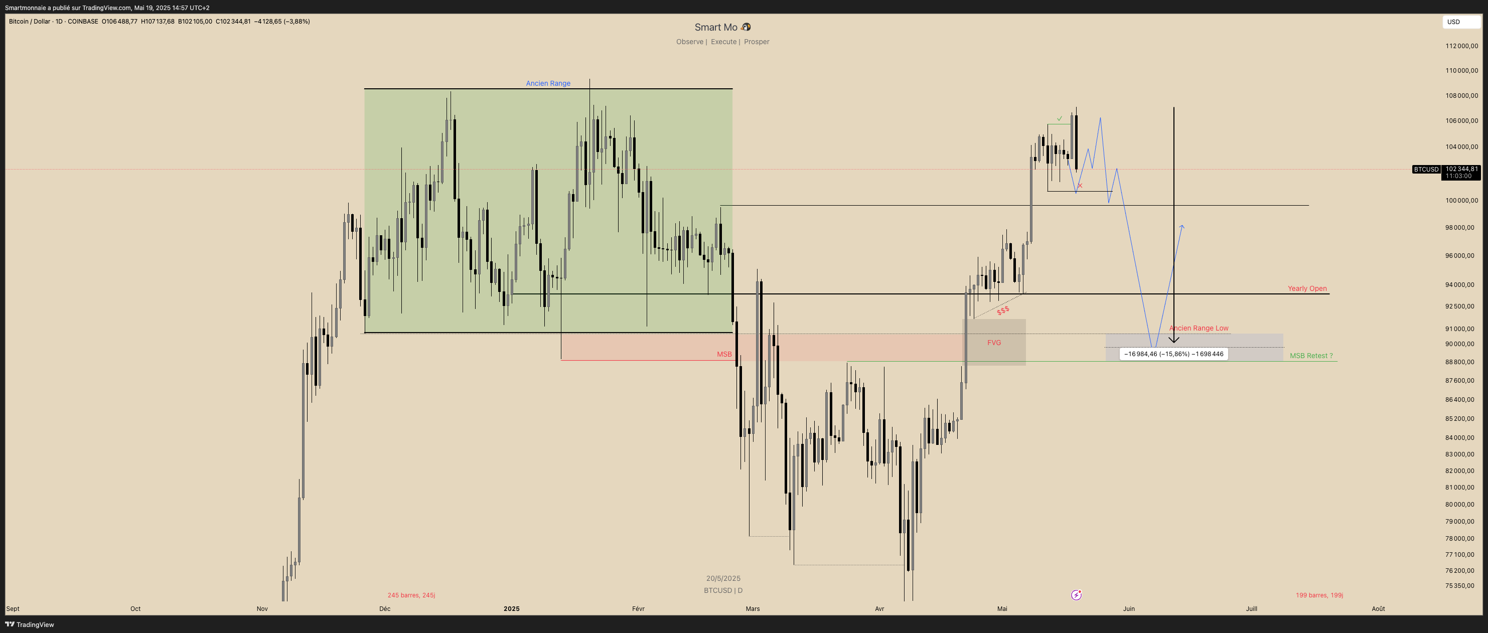 Voila maintenant plus d’un mois que Bitcoin à effectué un beau rebond en partie expliqué par la pause tarifaire de 90 jours initiée par Trump, et bien que le scénario d’une envollé au dessus des ATH pour faire fomo les break out longers était évoqué semaine dernière ici.