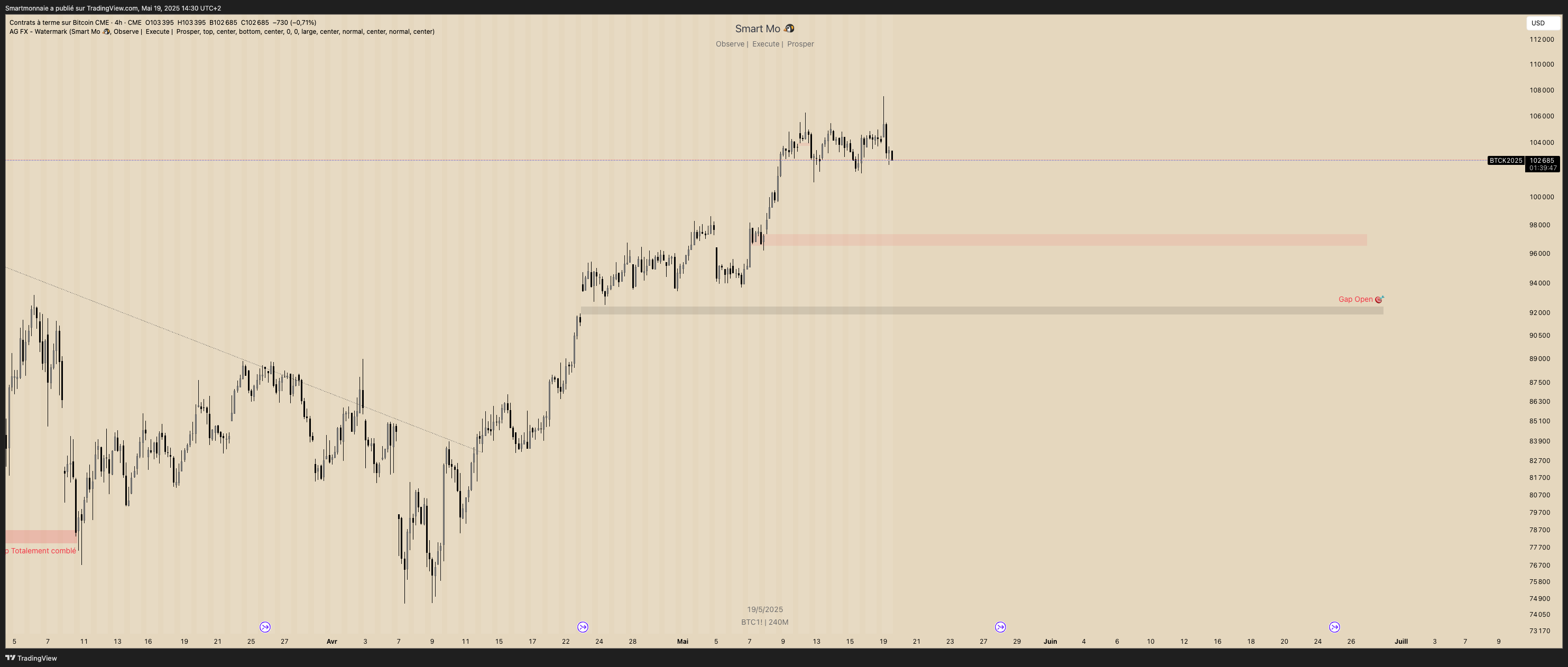 Le CME conflue pas mal avec cette analyse, puisqu’il à laisser également derrière lui un gap situé aux 92 000$.