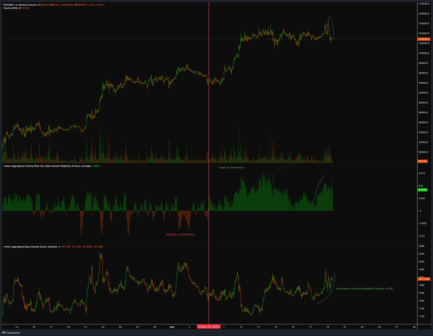 Sur Vélo, on voit assez bien le moment où les choses ont changé dans la tête des traders (trait horizontal rouge). Le dip au niveau des 93K $ est le moment à partir duquel le funding est repassé plus nettement positif. Plus récemment durant le week-end, on a vu le funding rate repartir à la hausse, ce qui coïncide avec des late longers qui ont accompagné le mouvement et continuent d’essayer de long une zone optimale pour repartir en ATH.