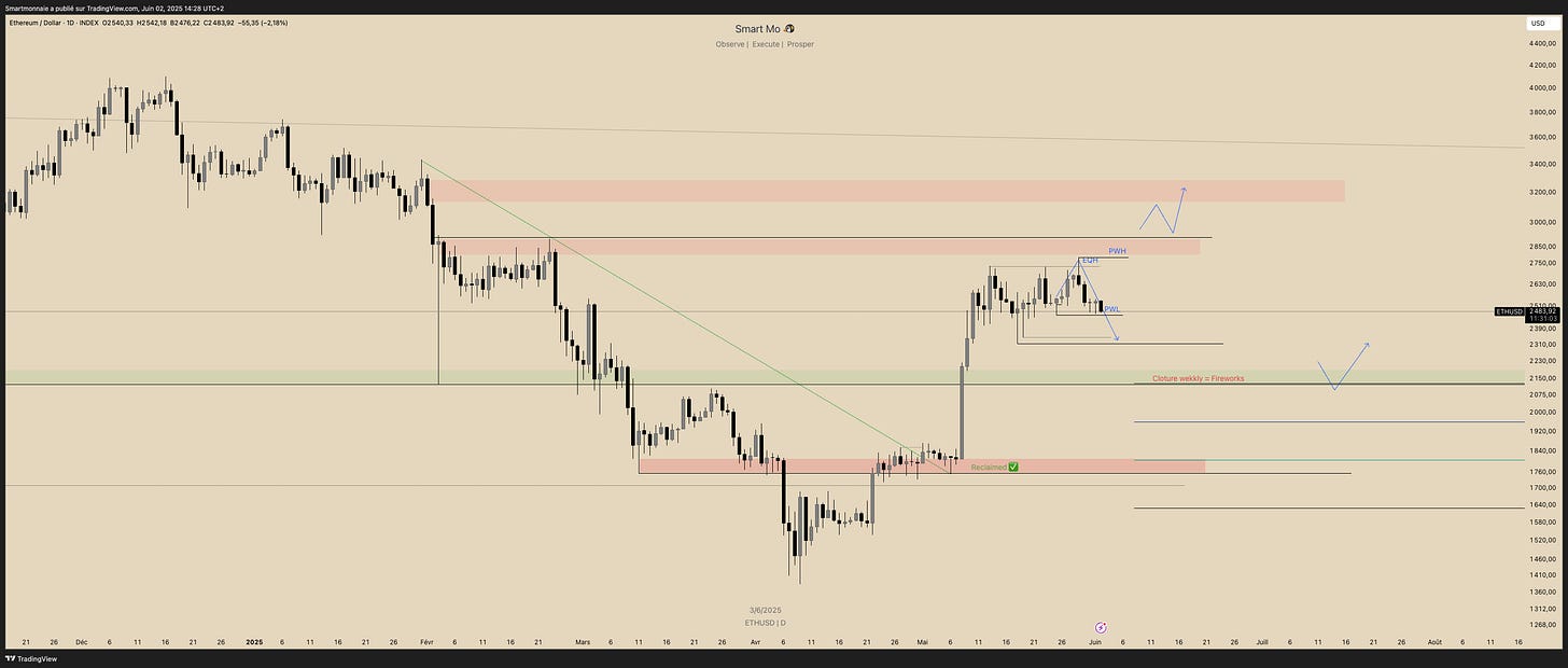 C’est le chemin qu’$ETH à choisi et il pourrait amorcer un repli vers la borne basse de son range de consolidation, avec une cible minimale autour des 2 315 $.