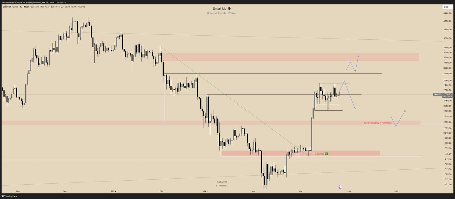 👉 Fait notable : malgré la pression baissière de Bitcoin cette semaine, ETH a relativement bien tenu, un signal potentiellement encourageant. Cela pourrait indiquer que les replis sont moins violents sur l’alt, et ouvrir la voie à une lecture plus fine du ratio ETH/BTC dans les sessions à venir.