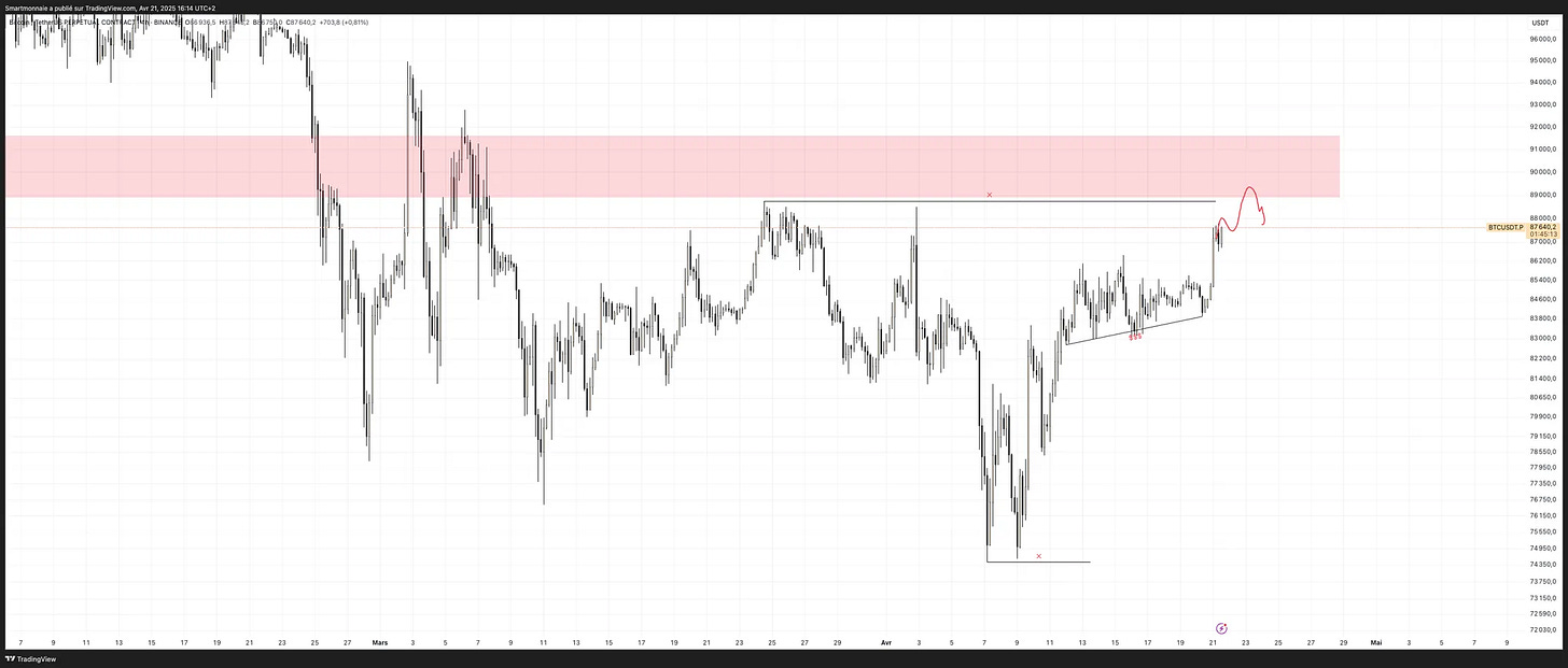 Cela nous permettrait d’éviter une confrontation directe avec la grosse zone de résistance des 92K+, et de construire un plancher plus solide avant de viser plus haut en ayant sweep les liquidités qui nous précède.