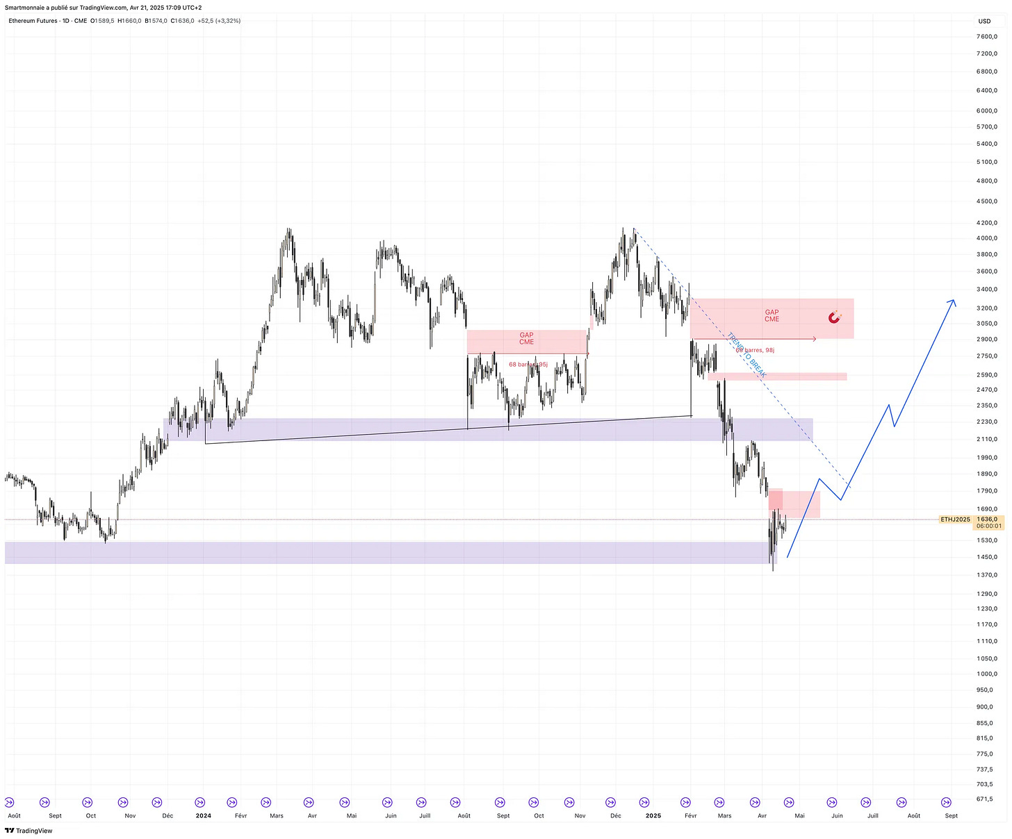 Du côté du CME, plusieurs gaps non comblés nous ouvrent le chemin du nord, avec le plus haut situé à 3300 $ soit un x2 depuis les niveaux actuels.