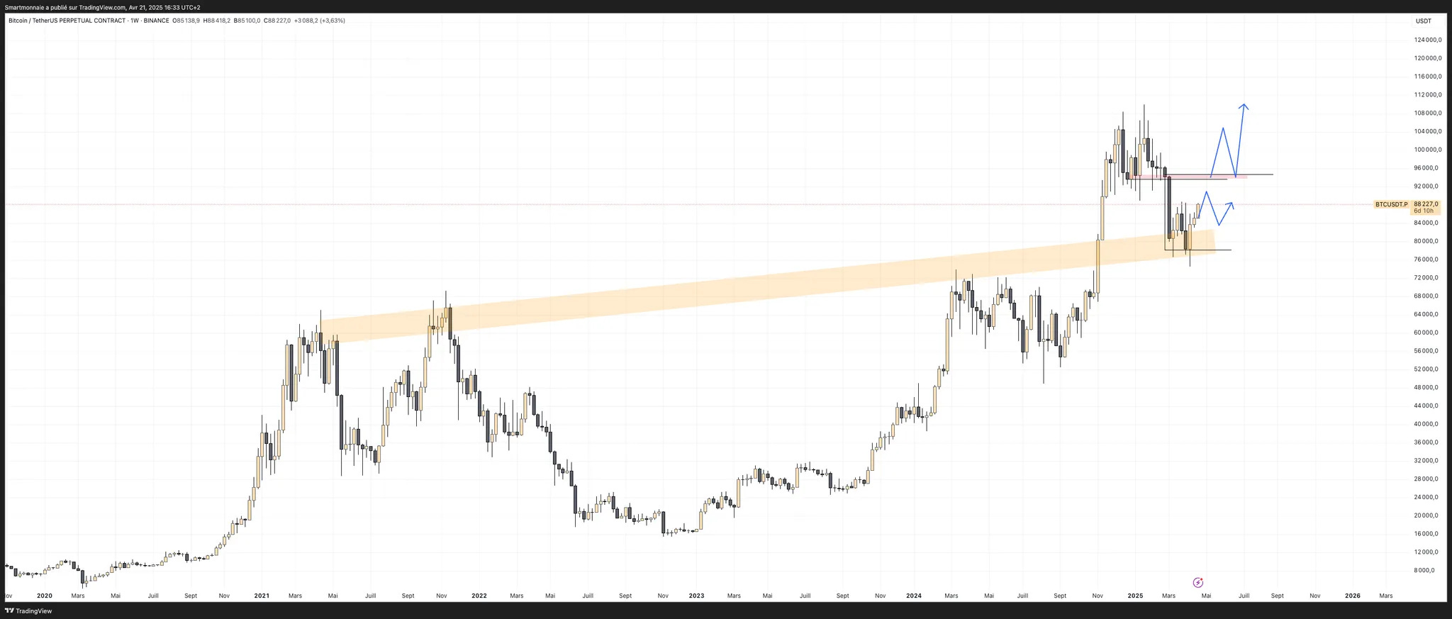 La zone des 88 723$ pourrait jouer le rôle de piège avant de potentiellement réintégrer plus bas pour venir chercher ces fameuses liquidités.