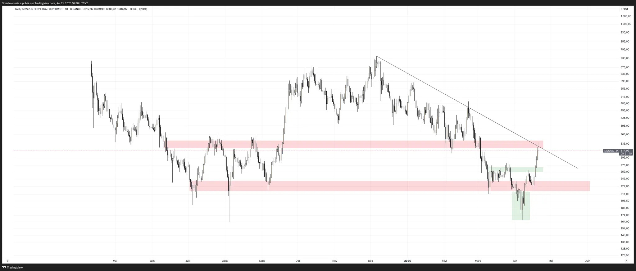 Pourquoi ? Car le prix est pile sous la trendline majeure qui agit comme une barrière baissière depuis fin 2023.