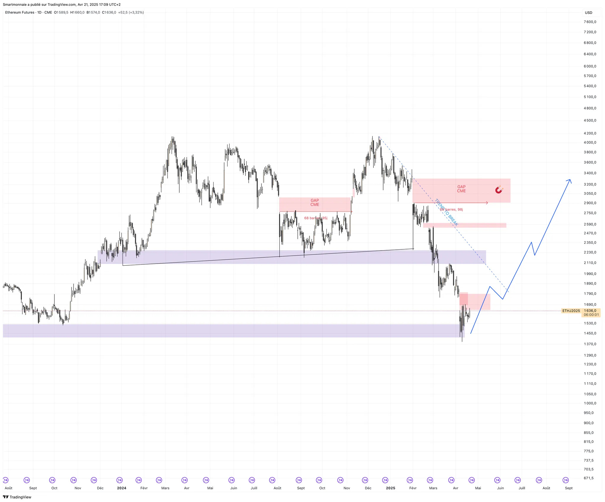 Du côté du CME, plusieurs gaps non comblés nous ouvrent le chemin du nord, avec le plus haut situé à 3300 $ soit un x2 depuis les niveaux actuels.