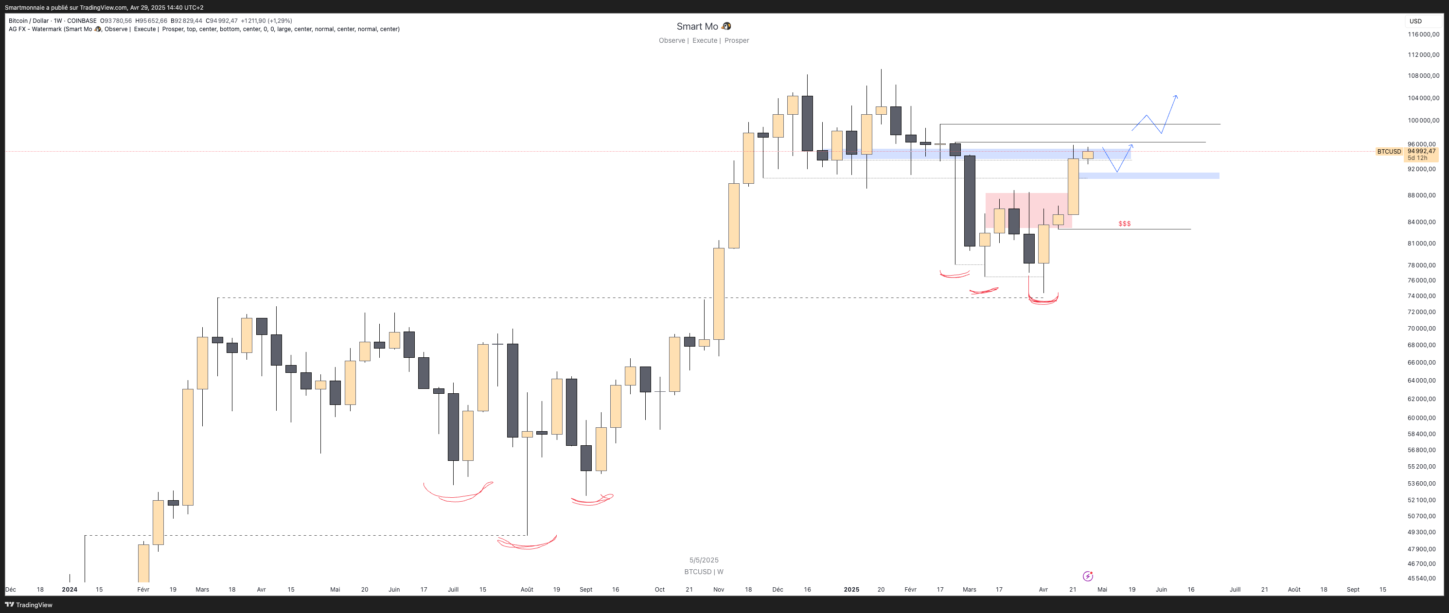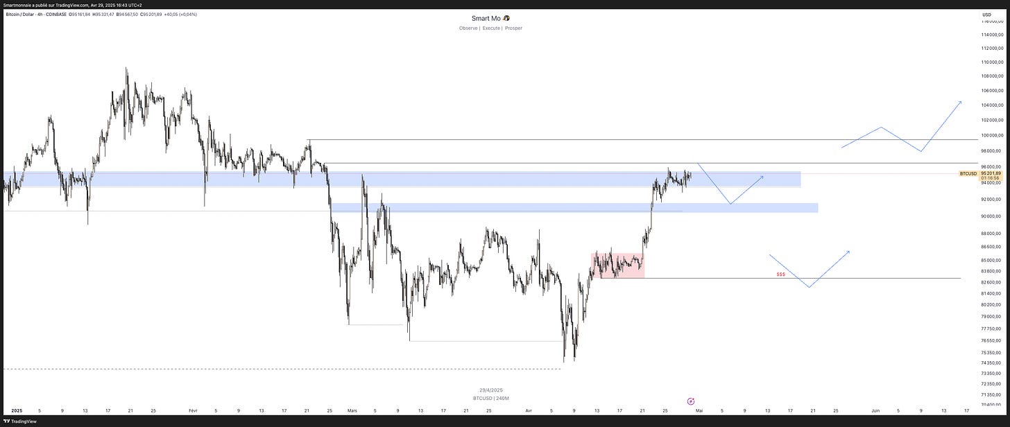 Actuellement, BTC consolide dans une zone clé autour des 94 000 à 96 000 $.