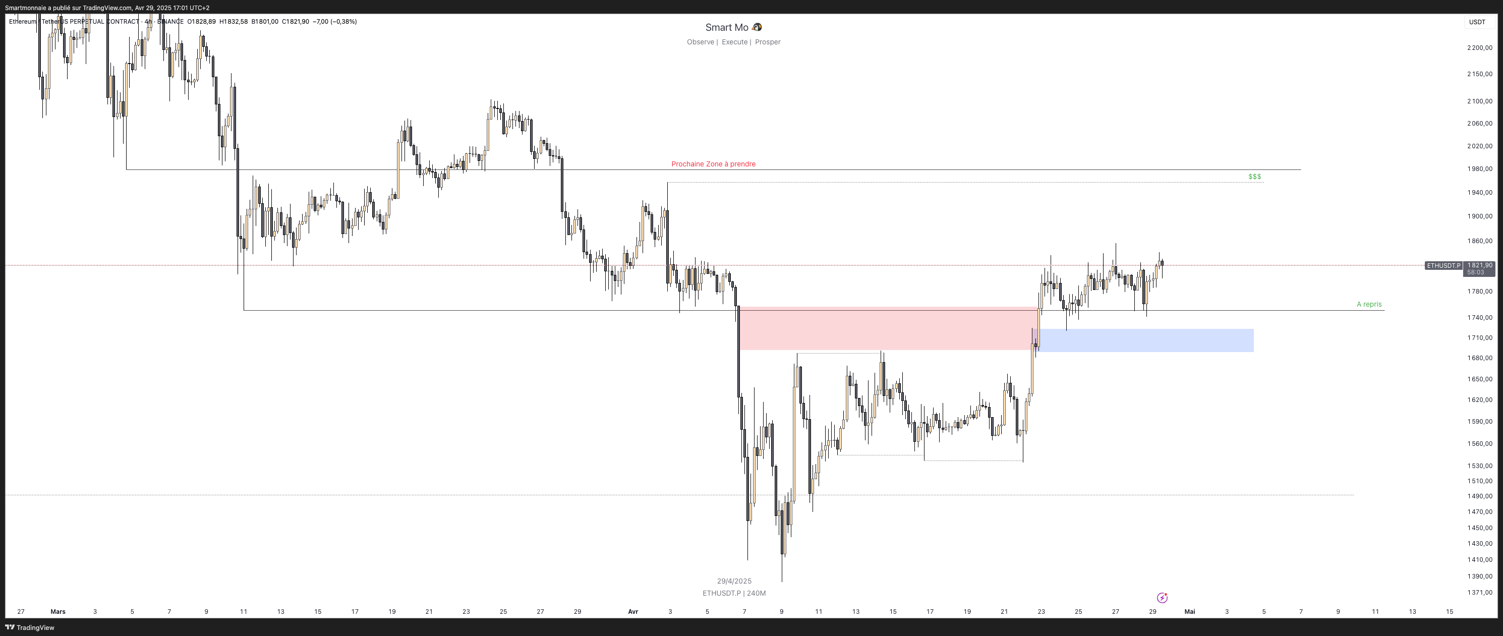 Intéressant de noter que $ETH à repris ce niveau qui devrait le préparer à deployer un plus grand mouvement et s’attaquer à la zone dure qui avoisine les 2K moment à partir du quel si une cloture weekly opère au dessus de ce niveau je pense qu’on peut s’attendre à un $ETH qui grimperait assez rapidement et potentiellement redonnerait une santé à $ETH/$BTC