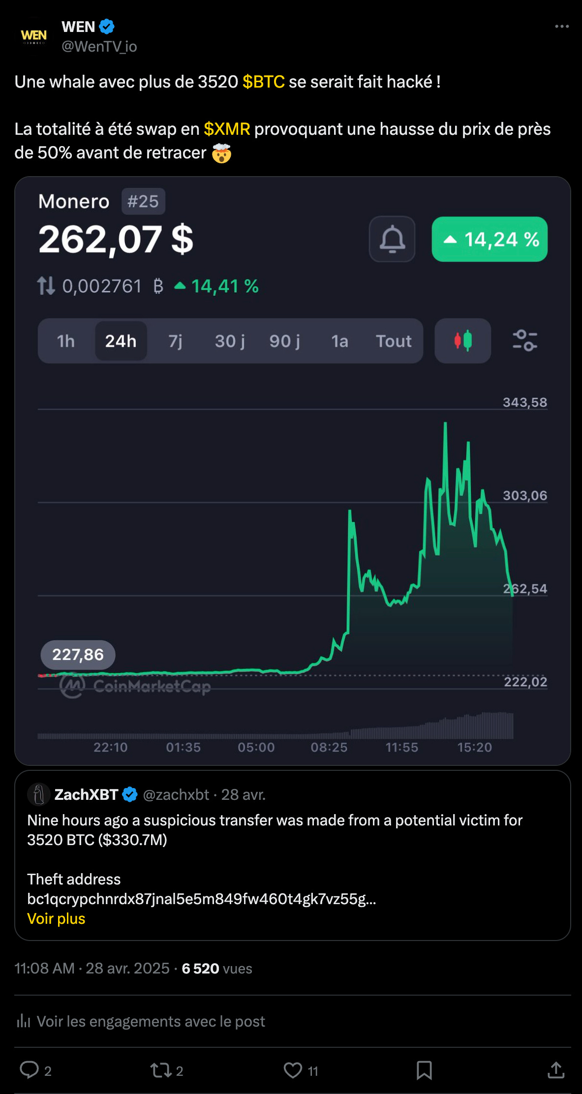 En effet une whale Bitcoin se serait faite dérober 3520 $BTC qui on était en totalité swap vers $XMR.