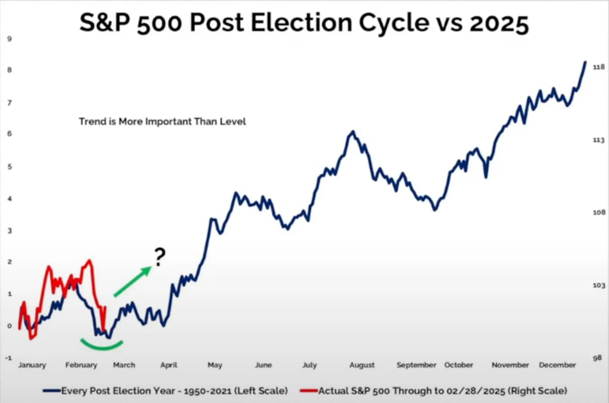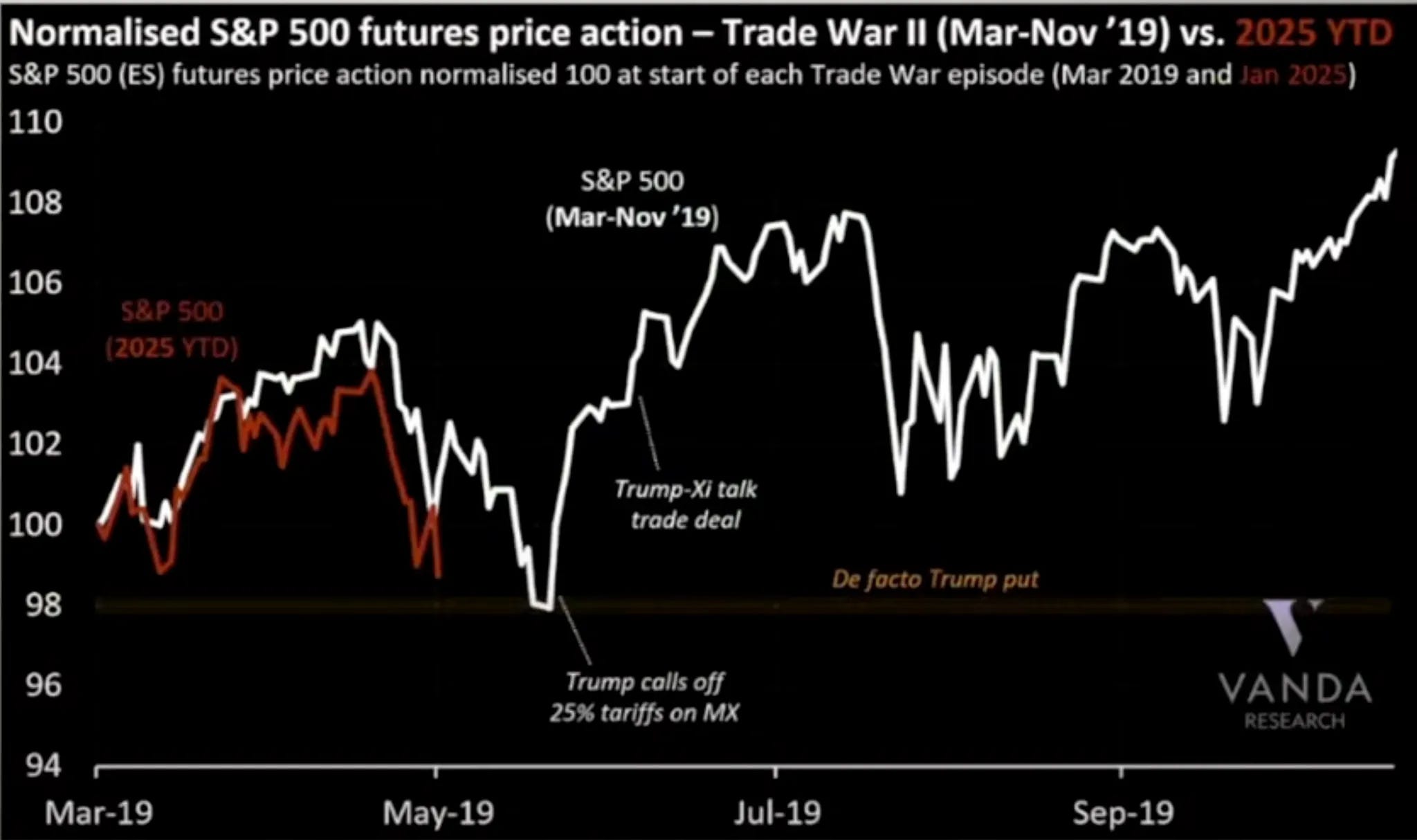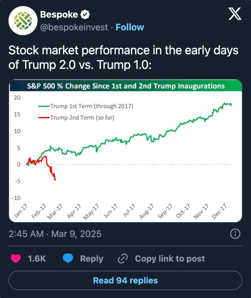 Le marché boursier n’apprécie pas les allers / retours de Trump, la divergence avec les débuts de son premier mandat étant sans appel.