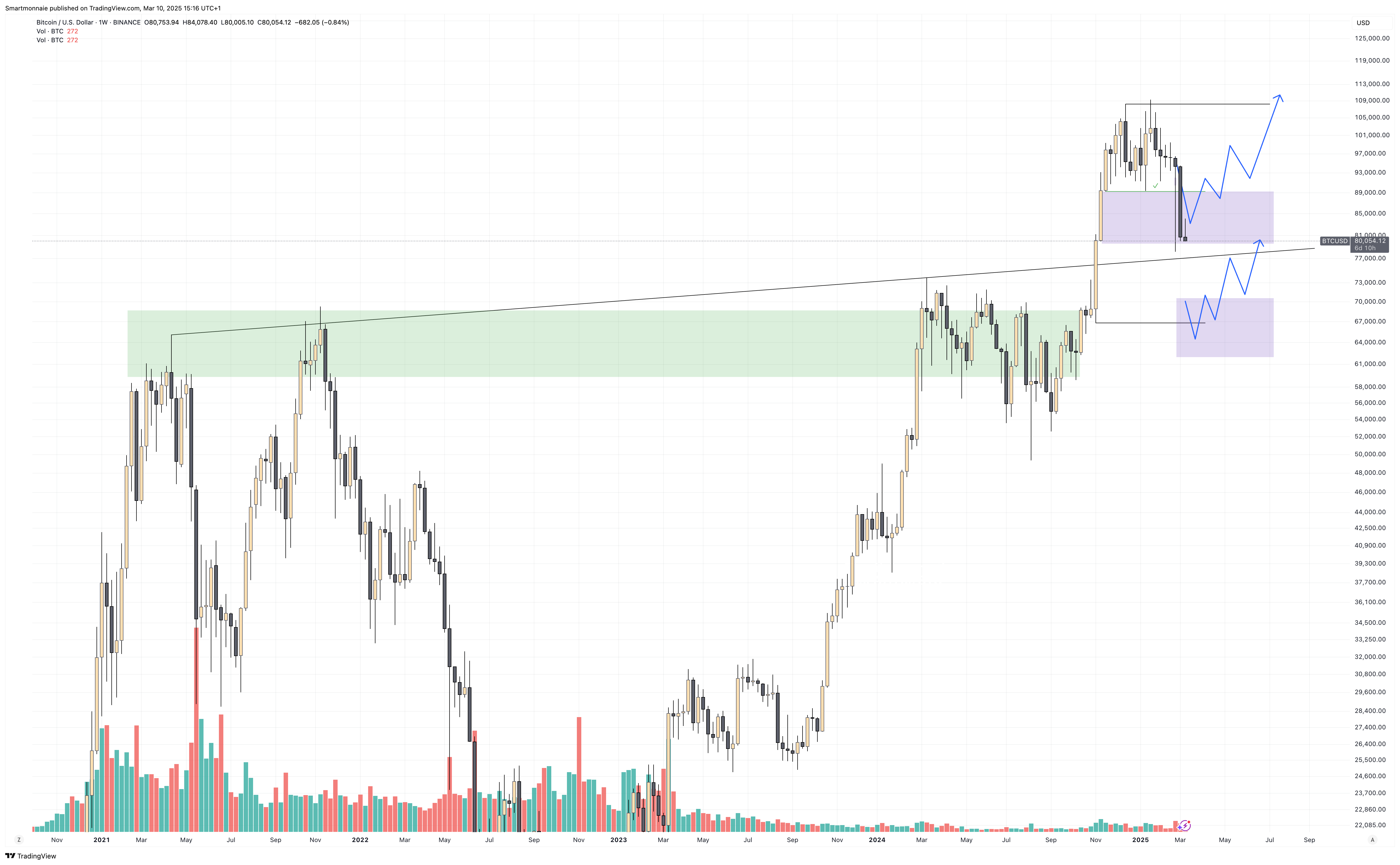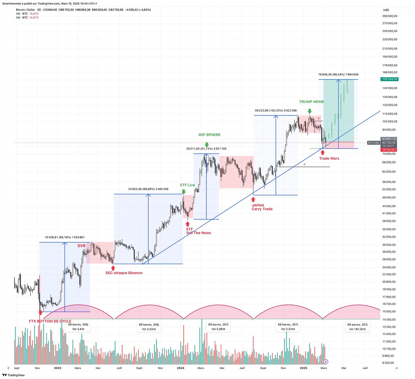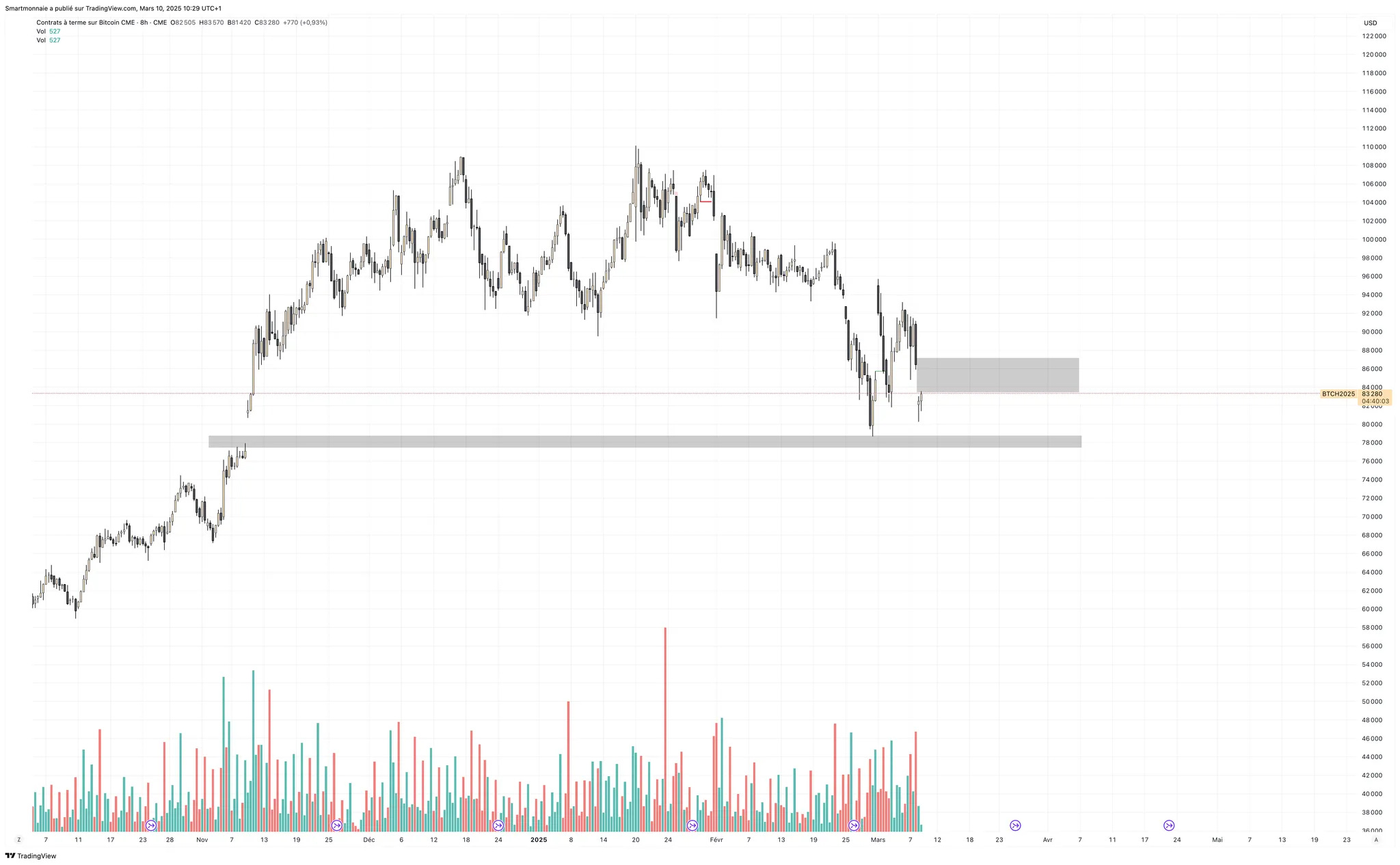 En cas de perte de ce niveau, un retour vers l’ancien ATH semble être la cible probable, avec potentiellement une mèche baissière jusqu’aux 64-66K$.