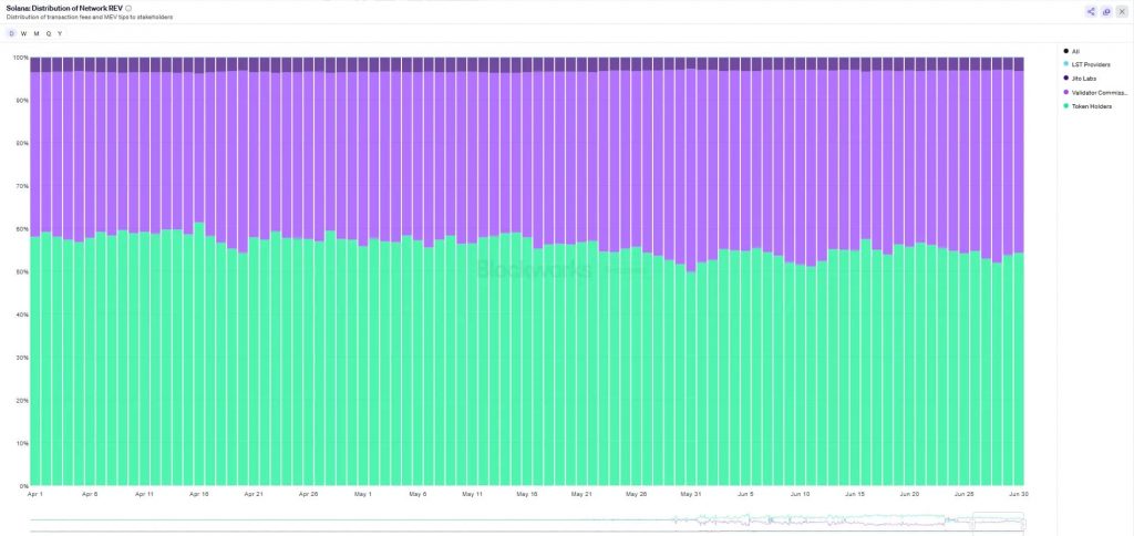 Concernant la répartition et la distribution de la REV, les chiffres révèlent une répartition claire des revenus économiques du réseau : 54% pour les détenteurs de tokens (SOL), 42% pour les commissions des validateurs, et le reste partagé entre Jito Labs (5%) et les fournisseurs de LST.