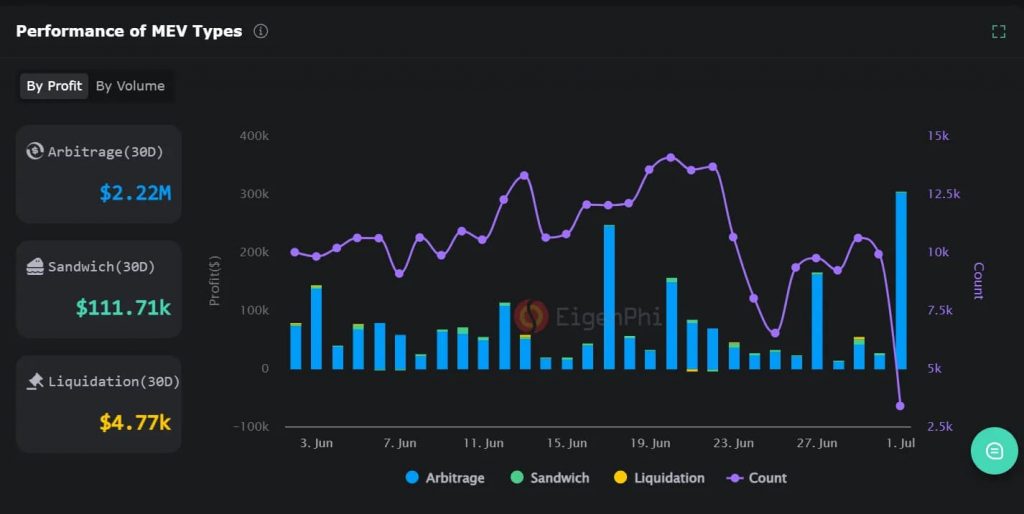 Enfin comme montré sur le graphique, l’arbitrage représente la forme la plus répandue et la plus rentable de capture de MEV, et cela pour plusieurs raisons.