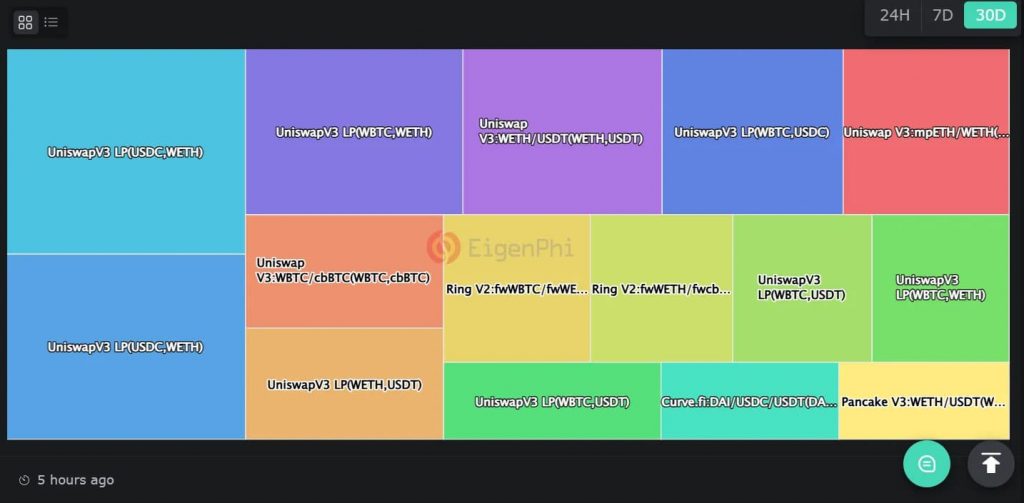 L’analyse des principaux pools touchés par le MEV sur les 30 derniers jours, illustrée par le graphique EigenPhi, montre une domination claire des pools Uniswap V3, notamment ceux composés de paires très liquides comme USDC/WETH, WBTC/WETH, ou WETH/USDT. On retrouve également quelques pools Curve, Pancake et Ring, mais la majorité des opportunités de MEV se concentrent sur Uniswap, qui représente à lui seul plus de 46% du volume total des DEX sur Ethereum.