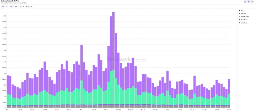 - Les 4 % restants vont à Jito Labs (5 % des Jito Tips) et aux LST providers comme Marinade, qui prélèvent des frais sur les récompenses de staking. Leur part, bien que modeste, montre l’émergence d’intermédiaires clés dans l’écosystème.