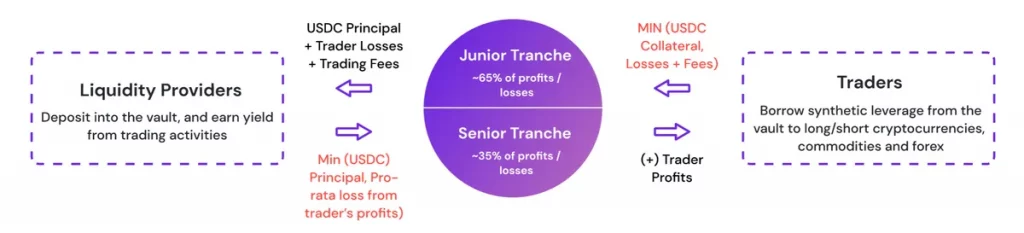 L’autre particularité d’Avantis, ce sont ses pools de liquidité en USDC. Les LPs déposent du capital qui sert de contrepartie aux traders : si le trader gagne, le vault paie son PnL ; s’il perd, c’est le vault qui encaisse. Autrement dit, les LPs parient contre les traders. Pour rendre ce système plus souple, Avantis a mis en place un modèle en deux tranches :