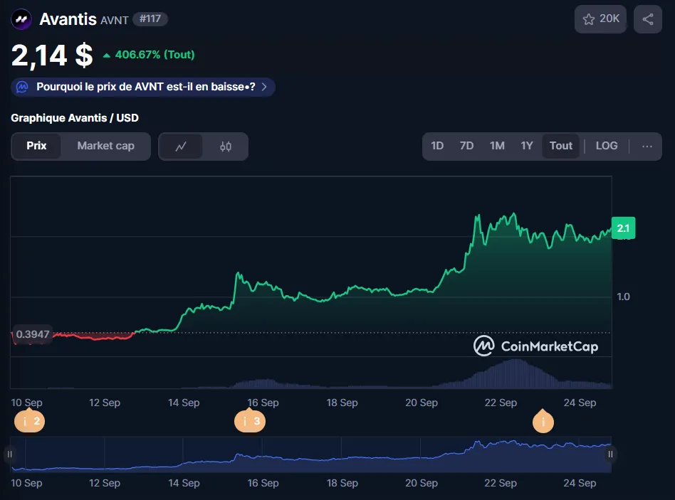 Le token AVNT a été lancé le 9 septembre 2025 à 0,24 dollar. 3 semaines plus tard, il cote déjà à 2,13 dollar, soit un joli x10. Sa market cap est passée de 36 à 551 millions de dollars, quasiment un x15. Et sa FDV flirte déjà avec les 2B, ce qui représente un multiple de quatre sur la valeur actuelle du token. Autant dire que le marché l’a repéré très vite.